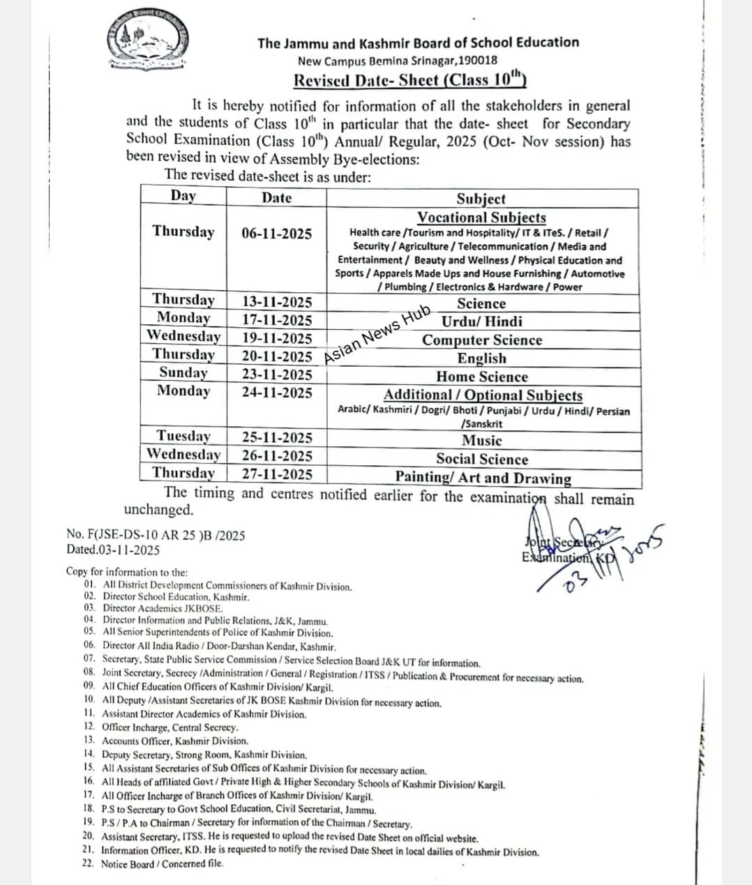 JKBOSE has directed all District Education Officers and School Heads to circulate the new schedule in students and ensure it is display on school notice boards immediately.