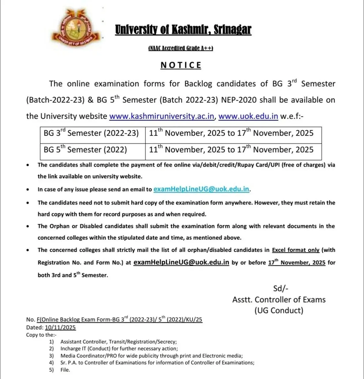 The University of Kashmir Srinagar has published important notification PDF regarding the online examination forms for BG 3rd Semester for Batch 2022–23 and BG 5th Semester for Batch 2022 backlog candidates under the NEP-2020 framework. According to the notice dated 10 of November 2025 students with pending backlogs in these semesters can submit their exam forms online from 11 of November 2025 to 17 of November 2025 through the university websites at www.kashmiruniversity.ac.in and www.uok.edu.in Notification also provide information about fees documents required and other important details: